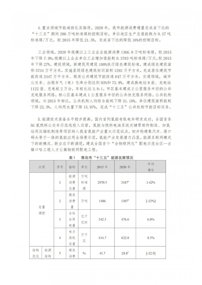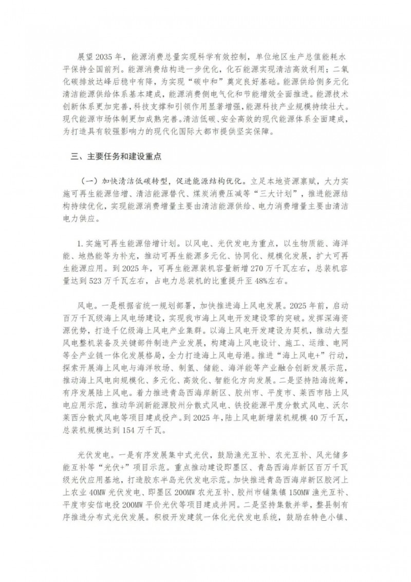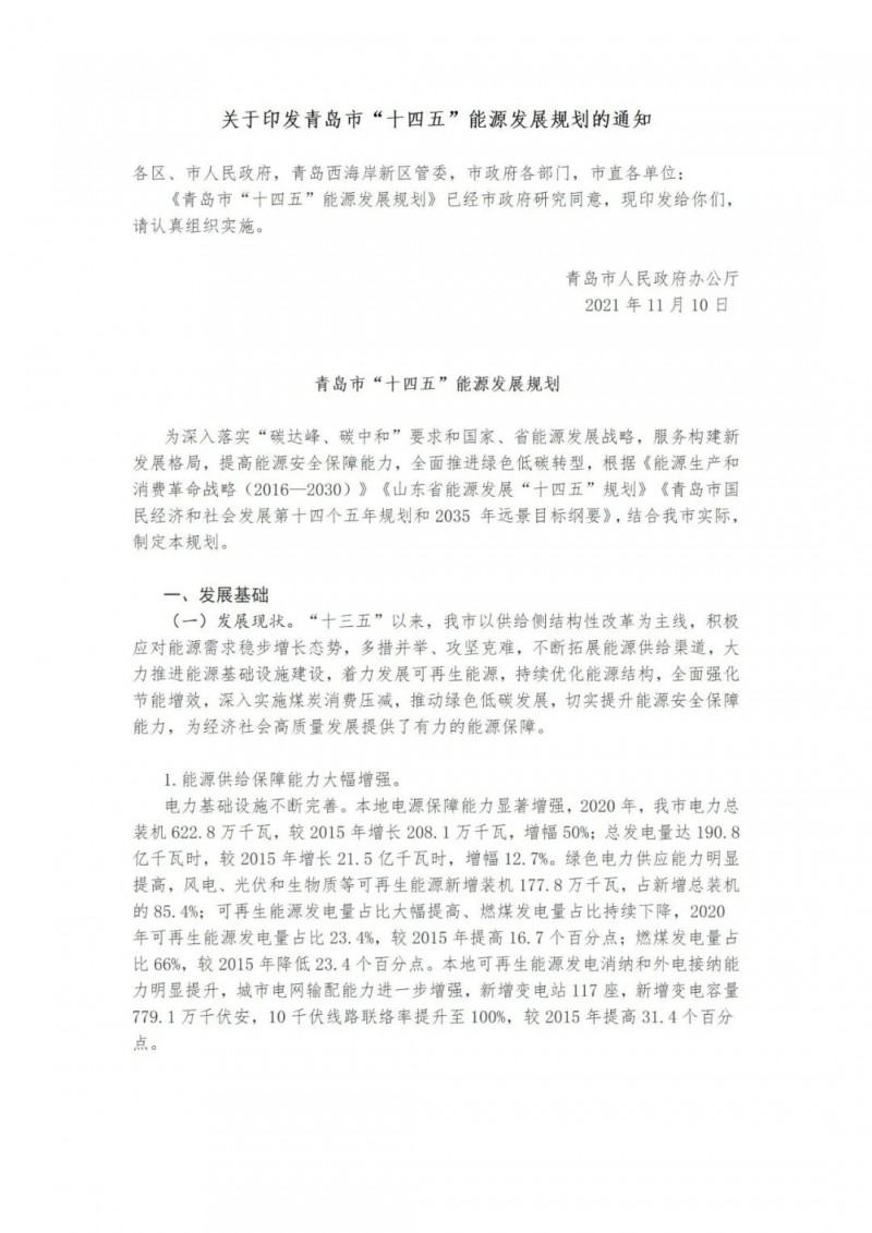 近日,山東青島市人民政府辦公廳印發(fā)了《關(guān)于印發(fā)青島市“十四五”能源發(fā)展規(guī)劃的通知》。提出了青島市“十四五”能源發(fā)展的主要任務(wù)和建設(shè)重點。實施可再生能源倍增計劃。以風(fēng)電、光伏發(fā)電為重點,以生物質(zhì)能、海洋能、地?zé)崮艿葹檠a充。到2025年,可再生能源裝機容量新增270萬千瓦左右,總裝機容量達到523萬千瓦左右,占電力總裝機的比重提升至48%左右。