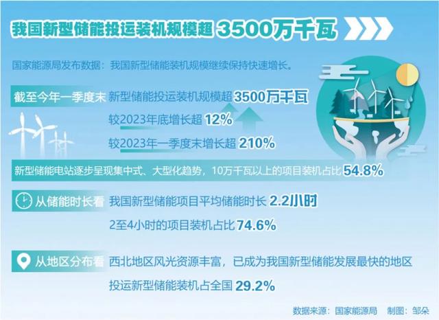 國家能源局發(fā)布數(shù)據(jù):我國新型儲能裝機(jī)規(guī)模繼續(xù)保持快速增長。截至今年一季度末,新型儲能投運(yùn)裝機(jī)規(guī)模超3500萬千瓦,較2023年底增長超12%,較2023年一季度末增長超210%。