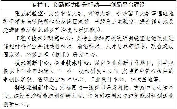 充分發(fā)揮長株潭國家自主創(chuàng)新示范區(qū)、湘江新區(qū)、湖南自貿(mào)區(qū)等國家級平臺優(yōu)勢,支持長沙加快引進(jìn)動(dòng)力電池、儲(chǔ)能電池關(guān)鍵材料及電芯電池高端制造等產(chǎn)業(yè)鏈關(guān)鍵環(huán)節(jié)項(xiàng)目和上下游優(yōu)質(zhì)企業(yè),加快產(chǎn)業(yè)創(chuàng)新平臺、中試測試平臺、檢驗(yàn)檢測平臺建設(shè),打造全球先進(jìn)儲(chǔ)能材料研發(fā)中心城市,株洲、湘潭配套建設(shè)一批電池正負(fù)極、電芯電池、電池回收利用等項(xiàng)目,強(qiáng)化三市產(chǎn)業(yè)協(xié)同效應(yīng),引領(lǐng)和帶動(dòng)全省鋰電池及先進(jìn)儲(chǔ)能材料產(chǎn)業(yè)高質(zhì)量發(fā)展。