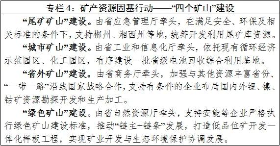 統(tǒng)籌開展鋰電池及先進(jìn)儲(chǔ)能材料產(chǎn)業(yè)所需鋰、錳、鎳等主要礦產(chǎn)資源調(diào)查評價(jià)及勘查,加強(qiáng)新能源礦產(chǎn)資源儲(chǔ)備和統(tǒng)籌開發(fā)利用。建設(shè)“尾礦礦山”,在滿足安全、環(huán)保及相關(guān)標(biāo)準(zhǔn)的條件下,支持開發(fā)利用尾礦庫資源。建設(shè)“城市礦山”,依托現(xiàn)有循環(huán)經(jīng)濟(jì)示范園區(qū)、省級化工園區(qū),有序建設(shè)一批電池回收綜合利用示范基地。加強(qiáng)與其他資源豐富省份戰(zhàn)略合作,支持有條件的企業(yè)布局建設(shè)“省外礦山”,提升資源供應(yīng)保障能力。