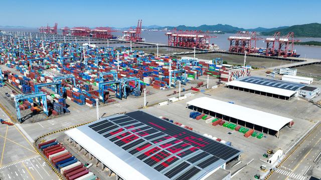 炎炎夏日,寧波舟山港梅山港區(qū)“綠意”正盎然:百米風機悠然轉(zhuǎn)動,清潔能源設備高效運行,岸電設施源源不斷地為集裝箱貨輪提供電能,搭載太陽能光伏發(fā)電系統(tǒng)的10臺遠控橋吊有序作業(yè)……綠色碼頭初具雛形。