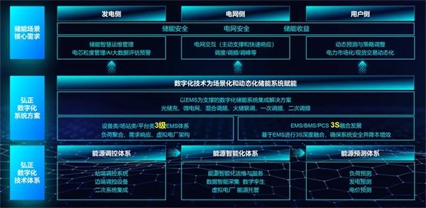 弘正儲(chǔ)能自成立以來,就把數(shù)字化作為儲(chǔ)能解決方案的切入點(diǎn),形成了能源調(diào)控、能源智能化和能源預(yù)測(cè)三大數(shù)字化儲(chǔ)能體系,結(jié)合自主研發(fā)的EMS能量管理系統(tǒng)強(qiáng)大的數(shù)據(jù)采集、轉(zhuǎn)發(fā)及邊緣計(jì)算能力,能夠充分滿足虛擬電廠對(duì)站點(diǎn)的數(shù)據(jù)采集、策略控制的各類要求,保障儲(chǔ)能設(shè)備能夠順暢地接入虛擬電廠平臺(tái)。
