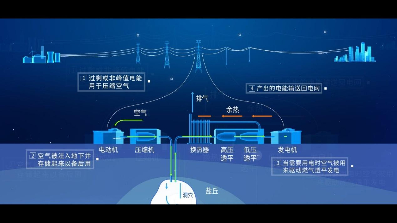 儲(chǔ)能時(shí),利用過?;蚍欠逯惦娔茯?qū)動(dòng)電動(dòng)機(jī)旋轉(zhuǎn),將電能轉(zhuǎn)化為機(jī)械能,電動(dòng)機(jī)帶動(dòng)壓縮機(jī)(一種將低壓氣體提升為高壓氣體的機(jī)械)將空氣從低壓狀態(tài)壓縮至高壓狀態(tài),并將高壓空氣儲(chǔ)存在儲(chǔ)氣裝置(鹽穴、人工硐室或儲(chǔ)氣罐)中,最終將電能轉(zhuǎn)換成空氣熱能和壓力能。