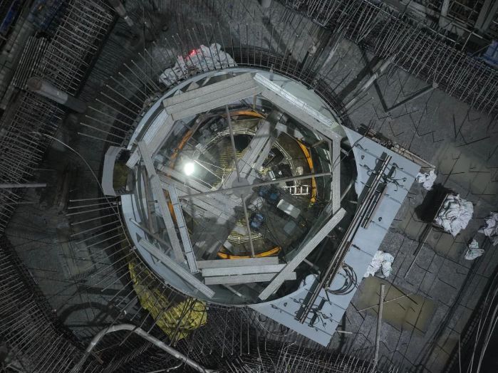 天臺抽蓄電站定子機(jī)座呈圓筒形,最大外形尺寸8.05米×8.05米×4.9米(長×寬×高),重量達(dá)80余噸,是發(fā)電電動(dòng)機(jī)的重要靜止部件,它將固定定子鐵心,承擔(dān)發(fā)電電動(dòng)機(jī)全部定子重量以及上機(jī)架和推力軸承重量,并承載從推力軸承傳遞下來的機(jī)組轉(zhuǎn)動(dòng)部件重量及水推力負(fù)荷。此次定子機(jī)座順利安裝為后續(xù)推進(jìn)定子鐵心疊片、定子線棒安裝等機(jī)電工作奠定了堅(jiān)實(shí)基礎(chǔ)。