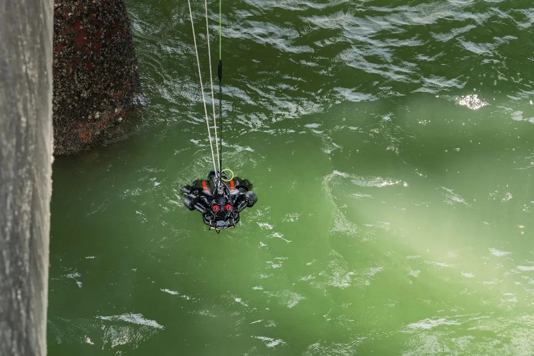 ▲水下智能巡檢機(jī)器人可對海上架空輸電線路樁基礎(chǔ)進(jìn)行探傷檢測和可見光巡查。(黃海鵬 攝)
