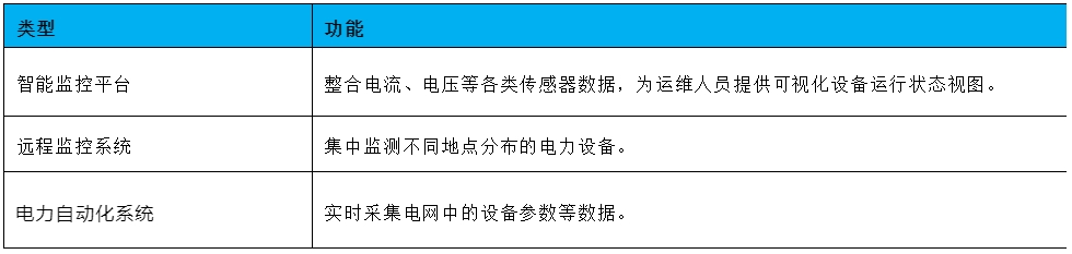 包括各類智能監(jiān)控平臺(tái)、遠(yuǎn)程監(jiān)控系統(tǒng)、電力自動(dòng)化系統(tǒng)等收集的設(shè)備運(yùn)行狀態(tài)和電網(wǎng)運(yùn)行信息。其功能見(jiàn)表4。