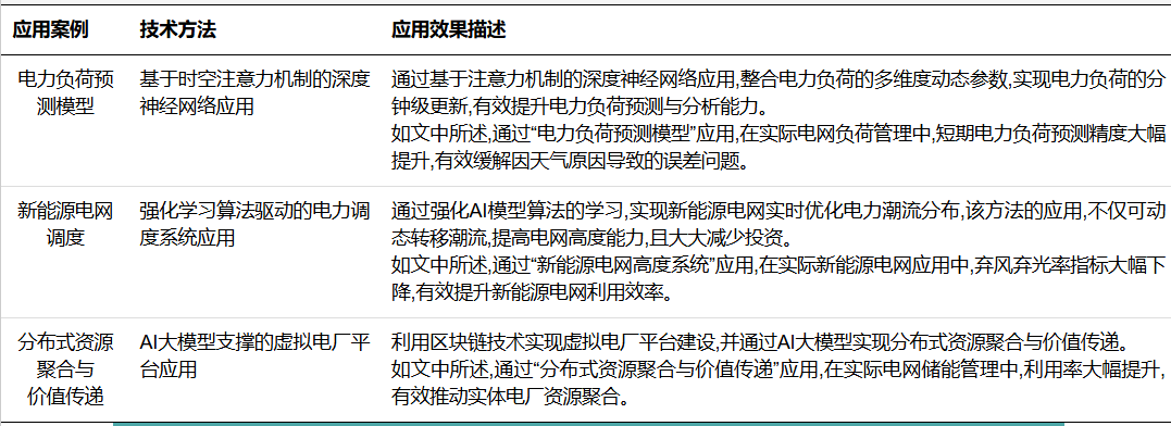 傳統(tǒng)的電力系統(tǒng)供需匹配存在發(fā)電慣性大、儲(chǔ)能能力不足、調(diào)峰能力有限、跨區(qū)域調(diào)配壁壘等問題,在大模型技術(shù)支撐下電力系統(tǒng)供需匹配的復(fù)雜性得到系統(tǒng)性突破?;跁r(shí)空注意力機(jī)制(指在時(shí)間和空間維度上對(duì)輸入數(shù)據(jù)進(jìn)行自適應(yīng)處理的方法)的深度神經(jīng)網(wǎng)絡(luò),整合用戶側(cè)用電數(shù)據(jù)、分布式能源+儲(chǔ)能、電力市場(chǎng)交易信息等多維度動(dòng)態(tài)參數(shù),構(gòu)建起分鐘級(jí)更新的負(fù)荷預(yù)測(cè)模型。筆者根據(jù)《國(guó)家電網(wǎng)報(bào)》的數(shù)據(jù)統(tǒng)計(jì)得出:2024年,在華東某省級(jí)電網(wǎng)的實(shí)測(cè)中,基于智能電網(wǎng)的AI大模型預(yù)測(cè)電網(wǎng)負(fù)荷,全網(wǎng)平均負(fù)荷預(yù)測(cè)準(zhǔn)確率達(dá)98.49%,日最高負(fù)荷預(yù)測(cè)準(zhǔn)確率達(dá)99.08%,數(shù)據(jù)收集工作時(shí)長(zhǎng)從30 min縮短至2 min,有效緩解傳統(tǒng)預(yù)測(cè)方法因天氣突變導(dǎo)致的誤差放大問題;針對(duì)高比例新能源接入的電網(wǎng),強(qiáng)化學(xué)習(xí)算法驅(qū)動(dòng)的調(diào)度系統(tǒng)實(shí)時(shí)優(yōu)化電力潮流分布,在西北某新能源基地的應(yīng)用案例中,棄風(fēng)棄光率(指在一定時(shí)間內(nèi),因各種原因?qū)е碌娘L(fēng)電和光伏發(fā)電未能被充分利用的比例)從12.6%降至3.8%,分布式潮流控制裝置總?cè)萘繛?.8萬kVA,可動(dòng)態(tài)轉(zhuǎn)移潮流10萬kW;大模型支撐的虛擬電廠平臺(tái)聚合海量分布式資源,通過區(qū)塊鏈技術(shù)實(shí)現(xiàn)價(jià)值傳遞,在國(guó)家電網(wǎng)廣東省試點(diǎn)項(xiàng)目中,用戶側(cè)儲(chǔ)能系統(tǒng)的利用率提升60%,需求響應(yīng)參與度達(dá)到83%,通過智能化的供需協(xié)同機(jī)制與AI大模型的深度應(yīng)用(如表2所示),推動(dòng)電力系統(tǒng)向“源網(wǎng)荷儲(chǔ)”深度互動(dòng)的新型模式演進(jìn)[3]。同時(shí),為避免單一數(shù)據(jù)源出現(xiàn)信息失真,國(guó)家電網(wǎng)通過AI大模型對(duì)溫度、濕度、風(fēng)速等主要參數(shù)進(jìn)行三重校驗(yàn)與交叉驗(yàn)證,有效避免數(shù)據(jù)誤差造成預(yù)測(cè)失真的問題。