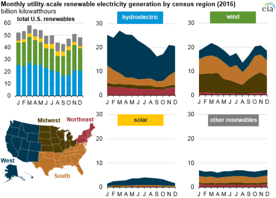 從發(fā)電量來看,今年3月份,美國(guó)可再生能源發(fā)電量達(dá)到全年最高。從地方來看,大部分可再生能源來自西部地區(qū),尤其是水電(占63%)和太陽能發(fā)電(占77%)。風(fēng)電產(chǎn)業(yè)相對(duì)發(fā)展比較均衡,中部地區(qū)占37%,南部占35%,西部占24%,東北部地區(qū)占4%。