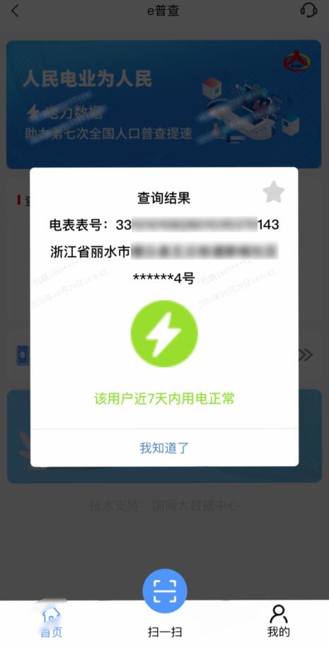 查詢操作也十分簡(jiǎn)單:只需打開網(wǎng)上國(guó)網(wǎng)app,點(diǎn)擊“e普查”模塊,掃描住戶用電電能表上的條形碼(即表號(hào)),隨后將自動(dòng)生成綠、黃、紅三種查詢結(jié)果,快速呈現(xiàn)出該住戶的用電情況。