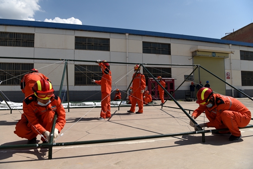 經(jīng)過20多分鐘的應(yīng)急演練,兩座防震帳篷按要求迅速搭建成功,1名受傷人員在緊急醫(yī)療救護(hù)后被迅速送往醫(yī)院。隨后,演習(xí)指揮部詳細(xì)檢查了防震帳篷搭設(shè)情況,聽取了各搶險(xiǎn)隊(duì)伍巡檢匯報(bào)。