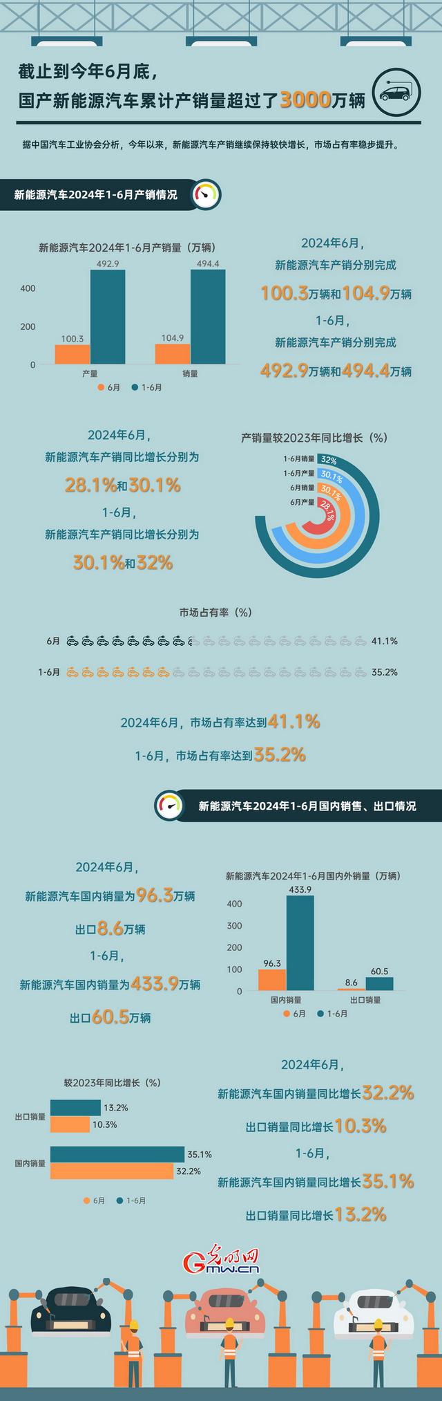 據(jù)中國汽車工業(yè)協(xié)會發(fā)布的數(shù)據(jù)顯示,2024年6月,新能源汽車產(chǎn)銷分別完成100.3萬輛和104.9萬輛,同比分別增長28.1%和30.1%,市場占有率達到41.1%。1-6月,新能源汽車產(chǎn)銷分別完成492.9萬輛和494.4萬輛,同比分別增長30.1%和32%,市場占有率達到35.2%。