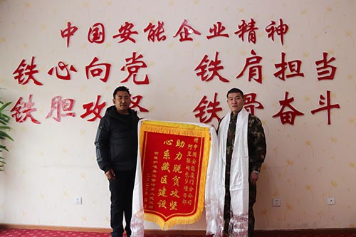中國電力網(wǎng)訊 4月20日上午,西藏日喀則市薩嘎縣達(dá)吉嶺鄉(xiāng)派出所所長旦增扎巴專程來到中國安能第二工程局阿里聯(lián)網(wǎng)線路包9項目部,為全體人員獻(xiàn)上潔白的哈達(dá),為項目贈送了印有“心系藏區(qū)建設(shè),助力脫貧攻堅”內(nèi)容的錦旗和感謝信,對項目積極承擔(dān)央企社會責(zé)任、助力脫貧攻堅的作為表示贊賞與感謝。“中國安能為我們幫了大忙,建設(shè)阿里聯(lián)網(wǎng)工程為我們送電,為我們解決務(wù)工難題,還支持我們建設(shè),我受我們鄉(xiāng)書記委托,專程過來感謝你們,我們達(dá)吉嶺鄉(xiāng)全鄉(xiāng)人民都感謝你們!” 他緊握項目經(jīng)理何樂峰的雙手,動情地說道。