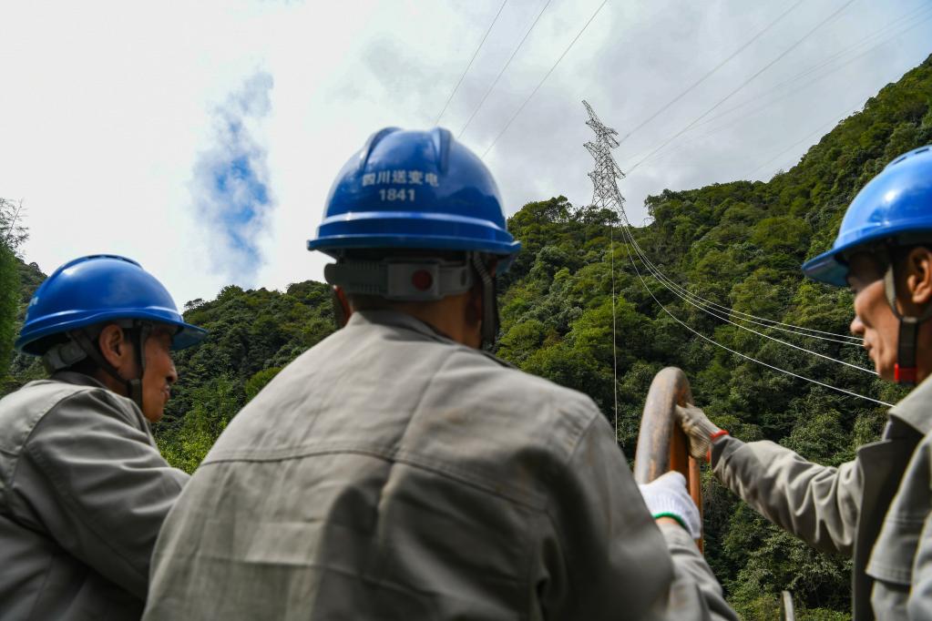 10月18日,在四川省雅安市天全縣喇叭河鎮(zhèn),技術(shù)人員在操作駐架車(chē)回卷三級(jí)導(dǎo)引繩。新華社記者 王曦 攝