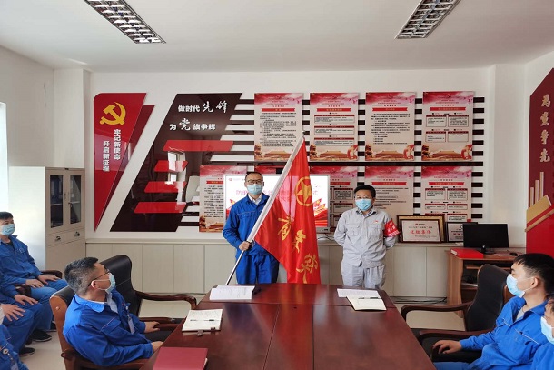 圖為該廠黨委書(shū)記為青年突擊隊(duì)授旗