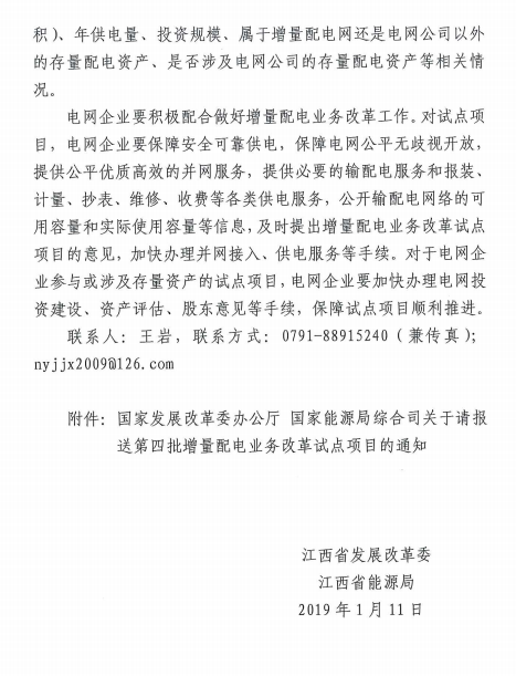 江西省發(fā)改委、江西省能源局日前聯(lián)合發(fā)布了《關(guān)于報(bào)送第四批增量配電業(yè)務(wù)改革試點(diǎn)項(xiàng)目的通知》,要求各地要結(jié)合工作實(shí)際情況,認(rèn)真總結(jié)前三批試點(diǎn)經(jīng)驗(yàn),按照國家相關(guān)要求盡快篩選符合條件的第四批試點(diǎn)項(xiàng)目,試點(diǎn)項(xiàng)目應(yīng)符合省級電網(wǎng)規(guī)劃。強(qiáng)調(diào)電網(wǎng)企業(yè)要積極配合做好增量配電業(yè)務(wù)改革工作。對試點(diǎn)項(xiàng)目,電網(wǎng)企業(yè)要保障安全可靠供電,保障電網(wǎng)公平無歧視開放, 提供公平優(yōu)質(zhì)高效的并網(wǎng)服務(wù),提供必要的輸配電服務(wù)和報(bào)裝、 計(jì)量、抄表、維修、收費(fèi)等各類供電服務(wù),公開輸配電網(wǎng)絡(luò)的可 用容量和實(shí)際使用容量等信息,及時提出增量配電業(yè)務(wù)改革試點(diǎn)項(xiàng)目的意見,加快辦理并網(wǎng)接入、供電服務(wù)等手續(xù)。