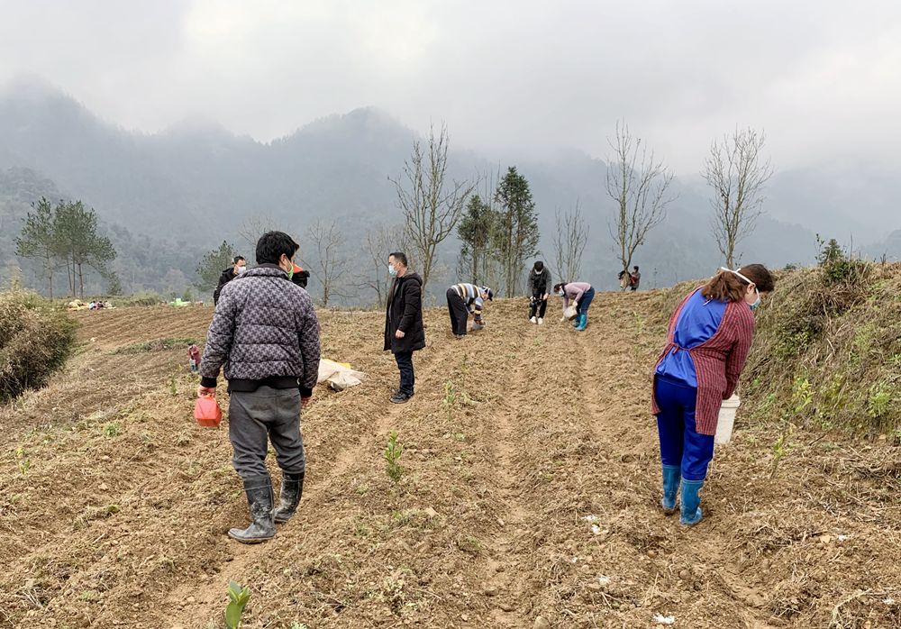 然而在村里的油茶種植基地里卻是另外一番場景,幾輛拖拉機(jī)來往運送土豆種子,二十幾個村民戴著口罩在地里忙碌著,整地、挖坑、選種、澆水、施肥,一幅生機(jī)勃勃的景象。