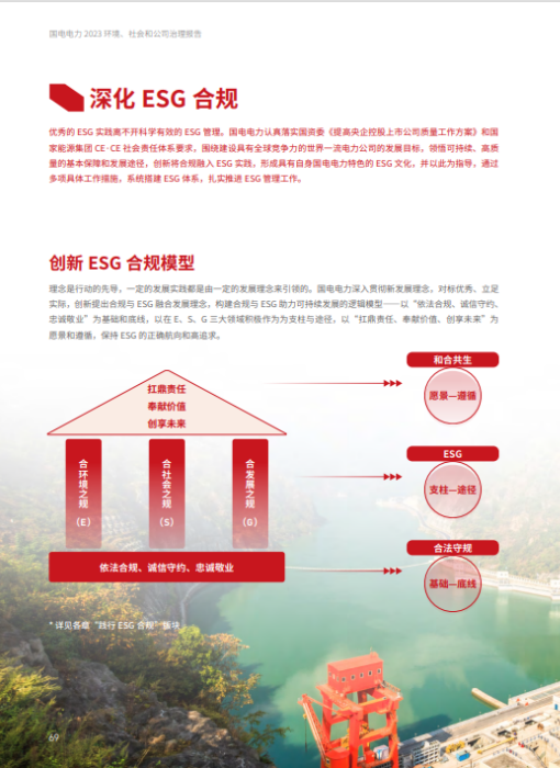 國電電力積極探索以質(zhì)量為支撐、誠信為基石、社會責任為核心、品牌為名片的“四位一體”建設(shè)路徑,創(chuàng)新提出ESG合規(guī)融合發(fā)展理念,精心打造“1+N”ESG報告體系,運用ESG治理思維指導業(yè)務(wù)工作,找準生產(chǎn)、經(jīng)營和管理與ESG體系建設(shè)的融合點,為高質(zhì)量推進ESG治理打下基礎(chǔ),助力加快建設(shè)具有全球競爭力的世界一流電力公司。