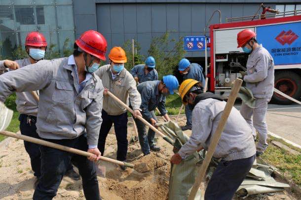 圖為該公司應(yīng)急演練人員正在裝沙袋