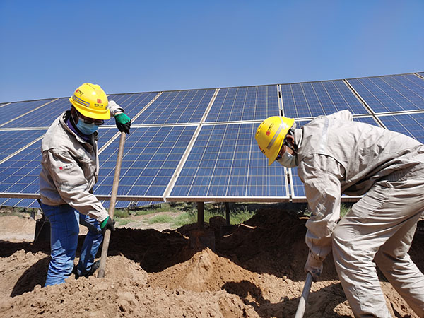 該光伏電站地處內(nèi)蒙古阿拉善烏蘭布和沙漠邊緣,現(xiàn)場土質(zhì)多為粉細砂,堅土層較薄,不利于光伏站內(nèi)箱式變壓器、逆變器、匯流箱及光伏組串等設(shè) 備基礎(chǔ)穩(wěn)固,特別在雨季時期,雨水對光伏組件基礎(chǔ)沖刷影響較大。該公司運維人員及時開展光伏組件基礎(chǔ)土方回填工作,現(xiàn)場采用機械填土和人工補填方式進行,一邊裝載車和挖掘機配合,將土方填至光伏板背光面,另一邊人工回填光伏板正下方區(qū)域。在控制土方高度時,運維人員嚴格按照規(guī)范要求,夯實并填平土方,保證光伏方陣組件最下端與地面距離不低于0.3米,確保光伏板受光良好。在控制加固工期期間,該公司運維人員早出晚歸、雷厲風(fēng)行,歷時兩天,順利完成任務(wù)區(qū)的基礎(chǔ)加固工作。