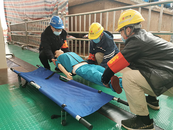 此次演練在主安裝廠(chǎng)2號(hào)機(jī)組大修現(xiàn)場(chǎng)進(jìn)行,模擬兩名施工人員在轉(zhuǎn)輪支架3米多高的平臺(tái)上焊接縫隙,一名工作人員未系安全帶進(jìn)行作業(yè),不慎摔倒墜落。該公司相關(guān)部門(mén)接到報(bào)告后,迅速啟動(dòng)應(yīng)急機(jī)制,立即撥打120緊急電話(huà),并通知應(yīng)急救援隊(duì)趕赴事故現(xiàn)場(chǎng)。救援現(xiàn)場(chǎng),應(yīng)急隊(duì)員迅速判斷危險(xiǎn)情況,并檢查傷員傷勢(shì),大家齊心協(xié)力將傷員轉(zhuǎn)移到安全地帶,拉起警戒線(xiàn),對(duì)傷員進(jìn)行緊急檢查。救援人員發(fā)現(xiàn)傷者腿部骨折,無(wú)法行動(dòng),立即進(jìn)行骨折包扎急救,按部就班、細(xì)致謹(jǐn)慎對(duì)傷口進(jìn)行消毒、止血、固定、包扎。最后,傷員被順利送往醫(yī)院。