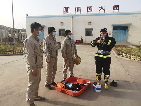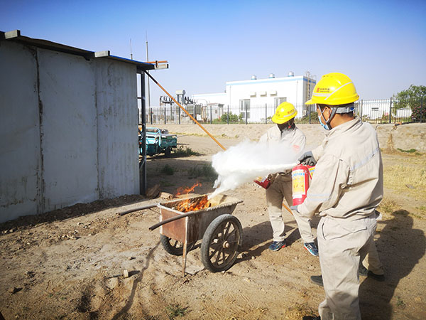 首先開展的是干粉滅火器實操演練。運維人員取出4具即將送檢的滅火器,用小推車裝好干柴放置在空曠地點,駐站人員講解了滅火器檢查方法和使用流程后,在確保安全的情況下將小推車內(nèi)的干柴點燃。一名工作人員用滅火器將車內(nèi)的火焰撲滅,再重新點燃,下一名人員繼續(xù)操作,最終達(dá)到參訓(xùn)人員全部能夠熟練使用滅火器的目的;其次,開展正壓呼吸器使用實操演練。在每個人都熟練掌握說明書上使用步驟和注意事項后,每名工作人員都穿戴正壓呼吸器一次,如果穿戴流程錯誤立即糾正并重新穿戴;再次,開展消防戰(zhàn)斗服穿戴實操演練。有火電消防工作經(jīng)驗的人員對戰(zhàn)斗服使用步驟進(jìn)行詳細(xì)講解,每名工作人員都穿戴消防戰(zhàn)斗服一次,達(dá)到全員均能熟練穿戴的目的;最后,所有參訓(xùn)人員都組裝并佩戴防毒面具一次。