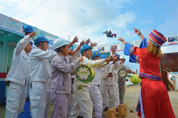 “粽情粽意,端午迎祥,堅(jiān)守崗位,履職盡責(zé)……”這是中國(guó)能建安徽電建二公司防城港項(xiàng)目部張富班早班會(huì)上高喊口號(hào)的情景。端午前夕,身穿壯族服飾的小姑娘黃發(fā)娟將粽子串起并拋出,班組成員爭(zhēng)相伸手接。只見,20余名施工人員拿著粽子,剝著鴨蛋,有說有笑。端午未至,可濃濃的粽香已彌漫整個(gè)核電現(xiàn)場(chǎng)……