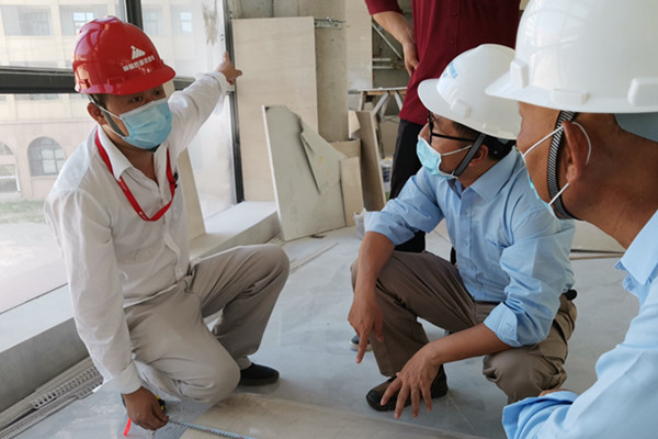09:00,廠前區(qū)辦公樓正在加緊施工,新到貨石材亟待驗(yàn)收。工程部值班人員會(huì)同施工監(jiān)理在廠前區(qū)連接體施工處檢查驗(yàn)收新到貨石材。
