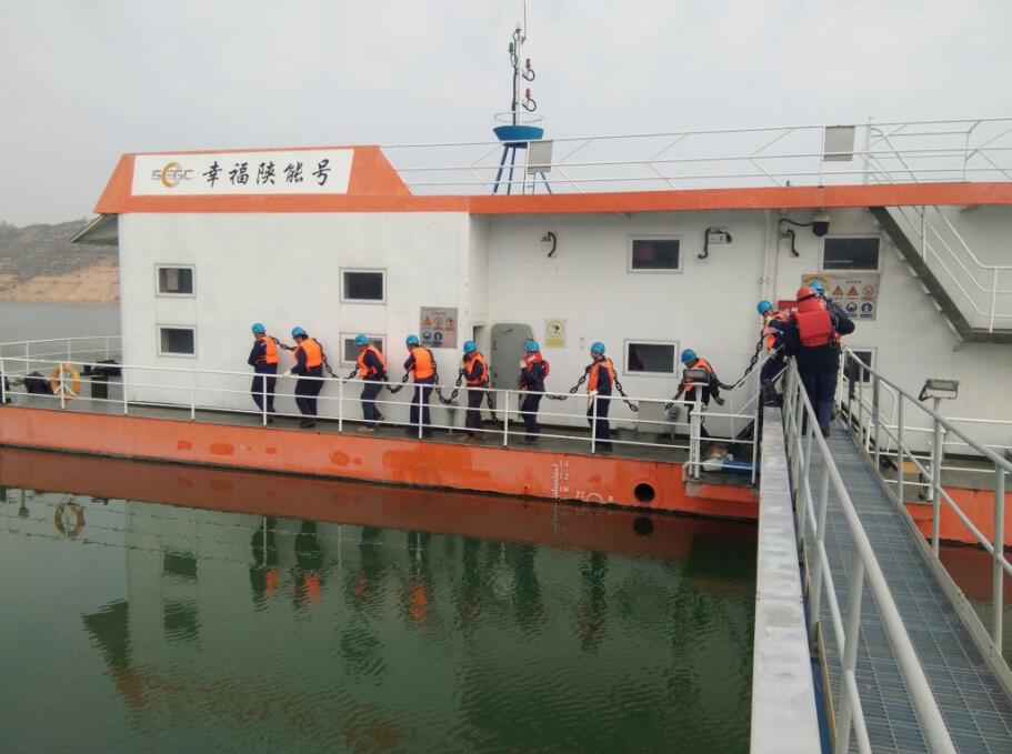 陜西能源趙石畔煤電生產(chǎn)用水,取自無定河流域王圪堵水庫地表水。取水主要設(shè)備集中布置在取水泵船,通過一根DN450鋼管,經(jīng)中繼泵站—高位水池送至廠內(nèi)原水池,總長約16公里。其中泵船出口220米管線,屬于地上部分,由11個(gè)浮箱支撐連接到岸邊,漂浮在水面的浮箱靠兩個(gè)牽引錨固定。泵船抵抗水流、大風(fēng)的作用,主要依靠首尾拋放的5個(gè)700公斤的霍爾錨通過錨鏈進(jìn)行調(diào)整固定。近期水庫水位上漲,泵船艏部13號(hào)錨鏈富余量不足,加長錨鏈工作迫在眉睫。公司新采購錨鏈長27.5米,重500公斤,岸邊到泵船有240米距離,無法通過機(jī)械運(yùn)送到位。材料重、廊道窄、臨水作業(yè),存在很大安全風(fēng)險(xiǎn),如何將錨鏈安全搬運(yùn)至泵船并連接安裝成為一道難題。為確保安全,趙石畔煤電相關(guān)技術(shù)人員進(jìn)行現(xiàn)場勘查,結(jié)合實(shí)際情況,最終確定采用人力搬運(yùn)通過0.8米寬、240米長的廊道運(yùn)到泵船上,再進(jìn)行安裝加長的工作方案。