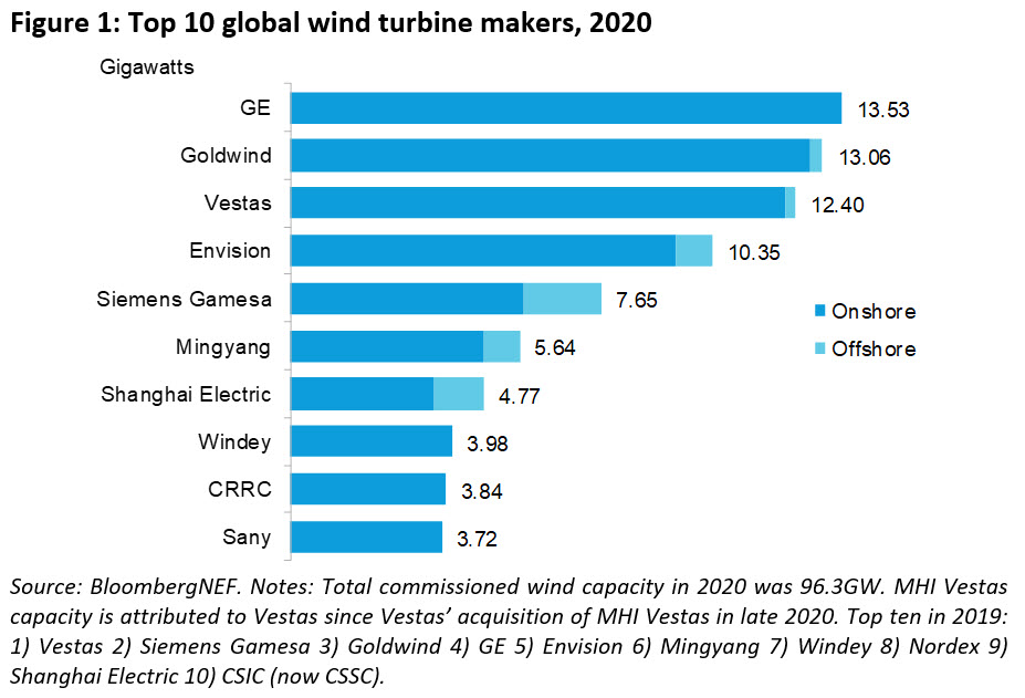 2020年,隨著美國(guó)和中國(guó)市場(chǎng)的快速增長(zhǎng),通用電氣成為全球最大的風(fēng)機(jī)制造商,占13.53吉瓦,其次是金風(fēng)科技(13.06吉瓦),維斯塔斯(12.4吉瓦),遠(yuǎn)景能源(10.35吉瓦),西門子歌美颯(7.65吉瓦)。