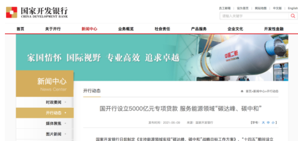 近期,國(guó)家開發(fā)銀行制定《支持能源領(lǐng)域?qū)崿F(xiàn)“碳達(dá)峰、碳中和”戰(zhàn)略目標(biāo)工作方案》,“十四五”期間設(shè)立總規(guī)模為5000億元(等值人民幣,含外匯)的能源領(lǐng)域“碳達(dá)峰、碳中和”專項(xiàng)貸款,其中2021年安排發(fā)放1000億元,助力構(gòu)建清潔低碳安全高效的能源體系。