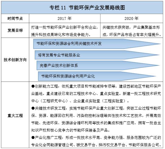 《貴州省“十三五”新興產(chǎn)業(yè)發(fā)展規(guī)劃》提出,著力突破鋼鐵冶金、有色金屬冶金、磷化工、煤化工、火電等原材料產(chǎn)業(yè)能耗高、污染大,以及固廢資源綜合利用附加值低等技術(shù)難題,開(kāi)發(fā)節(jié)能環(huán)保產(chǎn)業(yè)鏈中的關(guān)鍵共性技術(shù),形成一批擁有自主核心技術(shù)的節(jié)能環(huán)保骨干企業(yè)和一批比較優(yōu)勢(shì)明顯、產(chǎn)業(yè)配套完善、有序集聚發(fā)展的先進(jìn)節(jié)能環(huán)保產(chǎn)業(yè)基地;在資源綜合利用方面,大力發(fā)展源頭減量、資源化、零排放和產(chǎn)業(yè)鏈接等新技術(shù),推進(jìn)產(chǎn)業(yè)化,提高資源產(chǎn)出率。著力發(fā)展再制造產(chǎn)業(yè),實(shí)施高端再制造、智能再制造、在役再制造,推進(jìn)再生產(chǎn)產(chǎn)品認(rèn)定,促進(jìn)再制造業(yè)持續(xù)健康發(fā)展,到2020年,節(jié)能環(huán)保產(chǎn)業(yè)總產(chǎn)值達(dá)到140億元。重點(diǎn)發(fā)展先進(jìn)環(huán)保產(chǎn)業(yè)。