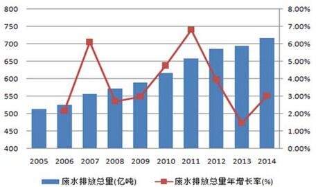 據統(tǒng)計,目前全國地表水體中Ⅰ類、Ⅱ類、Ⅲ類、Ⅳ類、Ⅴ類和劣Ⅴ類水質占比分別為31%、30%、21%、6%、9%和3%,其中Ⅳ類及Ⅳ類以下水質水體占比近4成,水質污染問題嚴重。每年水質污染給人體健康、工業(yè)生產、農業(yè)生產和漁業(yè)養(yǎng)殖等方面造成的經濟損失約2400億。。2014年全國廢水排放總量約為716億噸,較2005年的514億噸增長近4成,2005至2014十年間年復合增長率為3.4%,保持逐年穩(wěn)步增長。