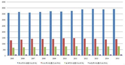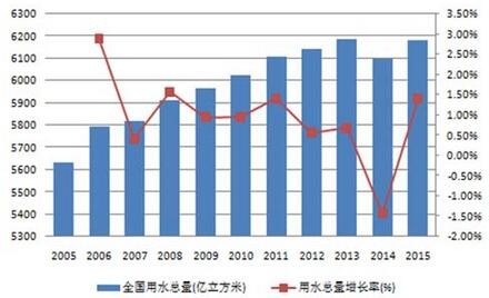 過去10年間,隨著人口增長,城市建設以及經濟增長,全國用水總量總體呈現持續(xù)增長態(tài)勢,在2015年達到6180億立方米。(其中,由于首次進行最嚴格水資源管理制度考核、以及農業(yè)水價綜合改革和工業(yè)用水差別水價政策的推進,2014年的農業(yè)和工業(yè)用水量分別出現下降,全國用水總量同時環(huán)比下降1.4%。)05至15年的用水總量年均復合增長率約為0.93%,據此計算到2030年全國用水總量將達到7100億立方米。這一預測與《全國水資源綜合規(guī)劃》劃定的2030年用水上限不超過7000億立方米基本一致。因此,在可預見的未來,用水量仍將繼續(xù)增長。