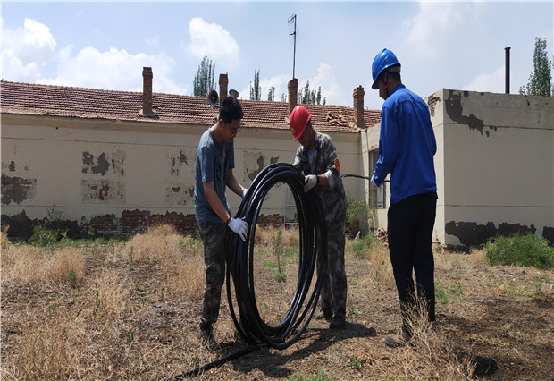 在了解情況后,烏海電業(yè)局工會扶貧辦積極與養(yǎng)殖場當?shù)氐牧逅墓╇姺志謱?。分局工作人員立刻前往逸夫小學扶貧養(yǎng)殖基地對整個院子進行了巡視,確定了電纜敷設的方案以及配電室的接線方式。第二天正值周末,六五四分局工作人員便進場施工。9名工作人員分工合理同時開工,鋪電纜、沿墻固定、埋電纜、配電室布線接電。烈日炎炎,在這場耐力與體力的考驗中,即使汗水浸濕了大家的衣服也絲毫沒有拖慢工作的進程,工藝也沒有因此打了折扣,最后大家齊心協(xié)力共同完成了420米電纜鋪設及接火停電的工作。