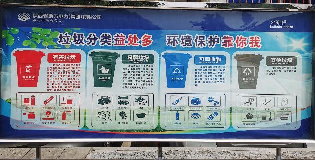 中國電力網(wǎng)訊(通訊員 李娟攝影報道)為倡導綠色生態(tài)、健康環(huán)保的生活方式,進一步倡導垃圾分類理念,近日,淳化供電分公司更新公司文化宣傳欄,對有害垃圾、易腐垃圾、可回收垃圾、其他垃圾等通過圖文并茂的方式做了詳細說明,通過宣傳推廣,營造人人關心垃圾分類、踐行垃圾分類的良好氛圍,讓"綠色、環(huán)保、低碳"的理念深入人心,從不而斷提高大家自覺愛護環(huán)境衛(wèi)生的意識,讓垃圾分類從口號變?yōu)榱晳T。