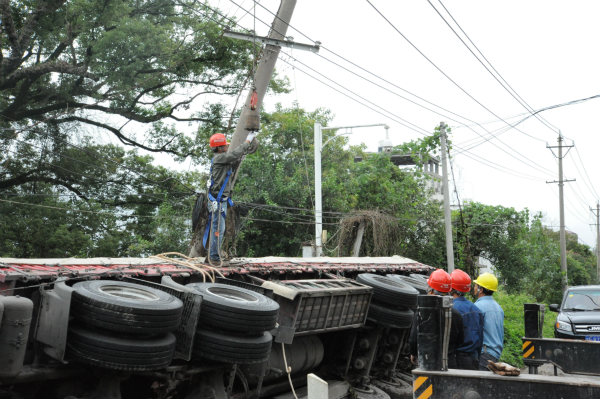 中國(guó)電力網(wǎng)訊  9月19日上午9點(diǎn)20分,由于一場(chǎng)意外的交通事故,10千伏夢(mèng)谷線76#桿被一輛側(cè)翻的貨車壓倒。而10千伏夢(mèng)谷線主要承擔(dān)廣昌縣夢(mèng)谷電商創(chuàng)業(yè)園以及附近答田村數(shù)個(gè)村小組的供電任務(wù),情況緊急,國(guó)網(wǎng)廣昌縣供電公司甘竹供電所在接到搶修工單的第一時(shí)間立即啟動(dòng)應(yīng)急搶修預(yù)案,組織了一只數(shù)十人的搶修隊(duì)伍前往事故發(fā)生地點(diǎn),并在趕往現(xiàn)場(chǎng)的同時(shí),安排相關(guān)臺(tái)區(qū)管理員做好停電用戶解釋工作。