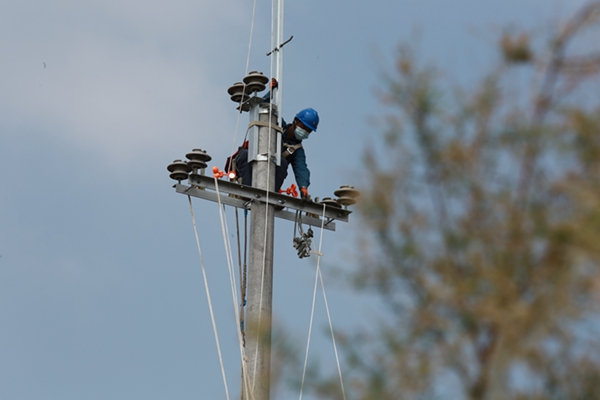 近日,在文家街道西河村,電力工作人員正在架設(shè)導(dǎo)線,將用電量超負(fù)荷的逢源線進(jìn)行割接,通過將線路延伸從而解決一部分用戶的用電低壓?jiǎn)栴}。