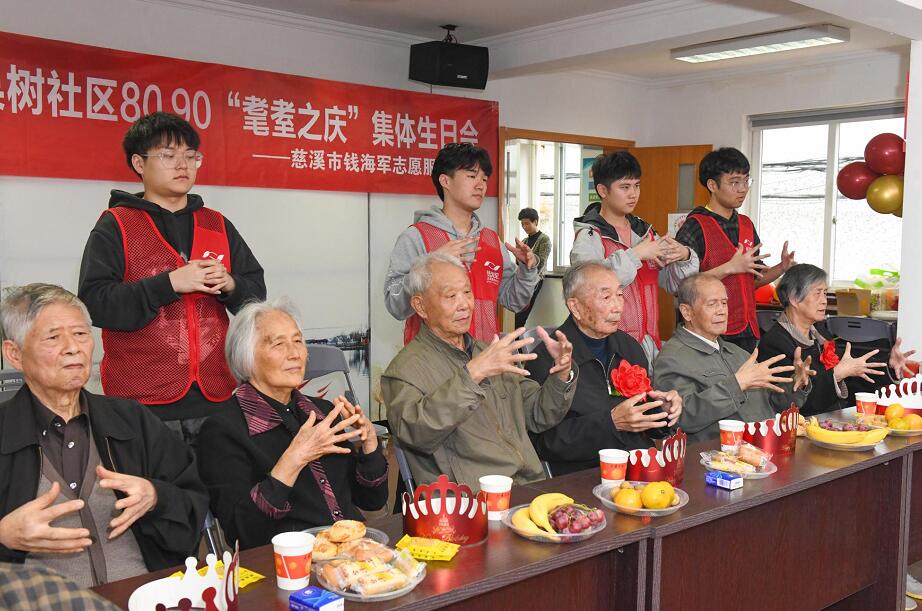 這是慈溪市白果樹社區(qū)第四屆“8090”耄耋老人集體生日會(huì)的現(xiàn)場(chǎng)。在重陽(yáng)節(jié)來臨之際,浙江慈溪市錢海軍志愿服務(wù)中心攜同白果樹社區(qū)和寧波大學(xué)科學(xué)技術(shù)學(xué)院,為社區(qū)內(nèi)30余名80歲以上老人們準(zhǔn)備了蛋糕、壽面和精彩的節(jié)目表演,提前給老人們過一個(gè)集體生日。