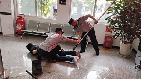 在反恐怖襲擊演練中,本次演練以該局鳳慶營(yíng)業(yè)廳內(nèi)突然出現(xiàn)2名不明身份窮兇極惡的持刀恐怖分子,挾持1名安保人員為演練假定場(chǎng)景。演練營(yíng)業(yè)廳值班人員信息報(bào)告、應(yīng)急響應(yīng)啟動(dòng)、人身救援、通訊聯(lián)絡(luò)等現(xiàn)場(chǎng)應(yīng)急處置過(guò)程。演練現(xiàn)場(chǎng), 2名持刀窮兇極惡的恐怖分子以辦事為由,在保安人員正當(dāng)詢問(wèn)及登記之際,恐怖分子手持管制刀具強(qiáng)行推開(kāi)營(yíng)業(yè)廳門(mén)闖入廳內(nèi),企圖用砍刀襲擊現(xiàn)場(chǎng)保安工作人員并直奔營(yíng)業(yè)廳平臺(tái)破壞電力營(yíng)業(yè)收費(fèi)管理正常秩序。營(yíng)業(yè)廳工作人員立即向應(yīng)急辦值班室匯報(bào),應(yīng)急辦主任聽(tīng)取應(yīng)急辦值班室匯報(bào)后,立即做出啟動(dòng)生產(chǎn)辦公場(chǎng)所反恐怖襲擊事件(四級(jí))應(yīng)急響應(yīng)的決定,安排有關(guān)保安和工作人員對(duì)現(xiàn)場(chǎng)進(jìn)行處置,保安人員并及時(shí)持盾牌、鋼叉等警用設(shè)備與暴徒對(duì)峙,采取應(yīng)急處置措施,終將恐怖分子制服。