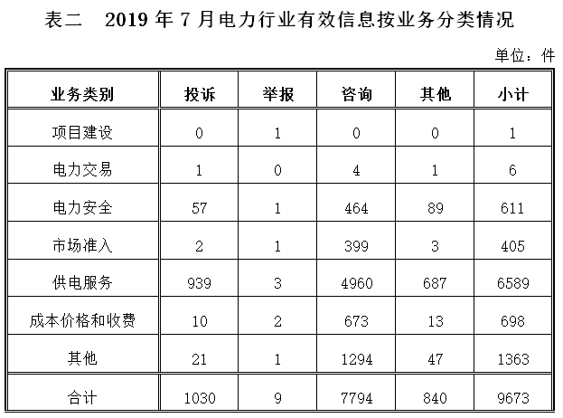 電力行業(yè)排在首位,有效信息數(shù)量為9673件,占全部有效信息的82.92%;其中受理的投訴舉報數(shù)量為1039件,占全部投訴舉報數(shù)量的96.38%。群眾反映的問題主要集中在供電服務(wù)、電力安全、成本價格和收費(fèi)等方面。(2019年7月電力行業(yè)有效信息按業(yè)務(wù)分類情況見表二)