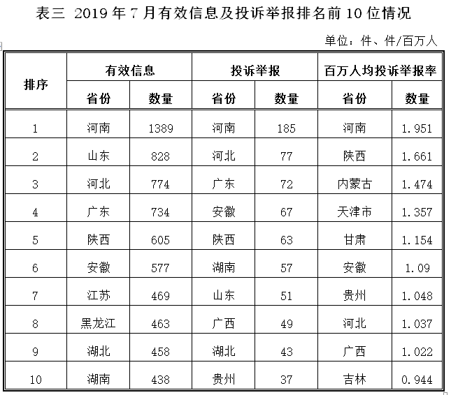各?。ㄗ灾螀^(qū)、直轄市)按照收到的有效信息數(shù)量排序,河南、山東、河北、廣東、陜西等排在全國前10位;按照投訴舉報數(shù)量排序,河南、河北、廣東、安徽、陜西等排在全國前10位;按照百萬人均投訴舉報數(shù)量排序,河南、陜西、內(nèi)蒙古、天津、甘肅等排在全國前10位。(2019年7月有效信息及投訴舉報排名前10位情況見表三)