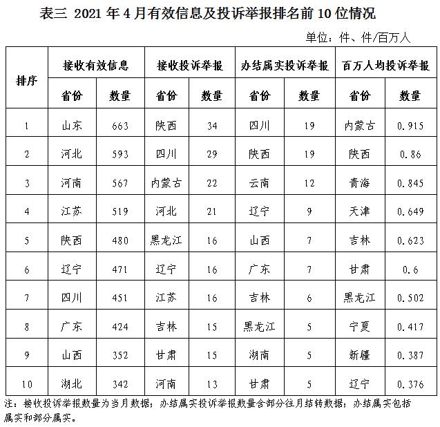 各省(自治區(qū)、直轄市)按照收到的有效信息數(shù)量排序,山東、河北、河南、江蘇、陜西、遼寧、四川、廣東、山西、湖北等列全國前10位;按照投訴舉報數(shù)量排序,陜西、四川、內(nèi)蒙古、河北、黑龍江、遼寧、江蘇、吉林、甘肅、河南等排在全國前10位;按照辦結(jié)屬實投訴舉報數(shù)量排序,四川、陜西、云南、遼寧、山西、廣東、吉林、黑龍江、湖南、甘肅等排在全國前10位;按照百萬人均投訴舉報數(shù)量排序,內(nèi)蒙古、陜西、青海、天津、吉林、甘肅、黑龍江、寧夏、新疆、遼寧等排在全國前10位。(2021年4月有效信息及投訴舉報排名前10位情況見表三)