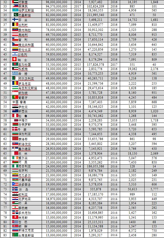 本文數(shù)據(jù)主要由美國(guó)中央情報(bào)局(CIA)統(tǒng)計(jì),但個(gè)別國(guó)家如中國(guó)、印度尼西亞、阿聯(lián)酋、菲律賓、尼泊爾、北馬里亞納群島等由該國(guó)的統(tǒng)計(jì)機(jī)構(gòu)統(tǒng)計(jì)。