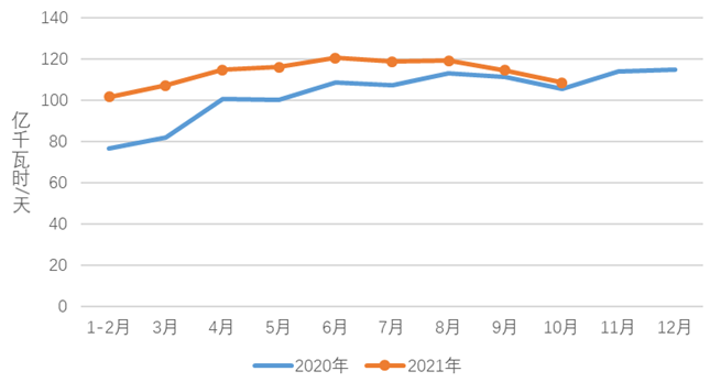 1-10月,化工行業(yè)用電量4156億千瓦時,同比增長8.1%,增速比上年同期提高7.7個百分點;建材行業(yè)用電量3434億千瓦時,同比增長10.0%,增速比上年同期提高7.5個百分點;黑色金屬冶煉行業(yè)用電量5302億千瓦時,同比增長8.8%,增速比上年同期提高5.6個百分點;有色金屬冶煉行業(yè)用電量5558億千瓦時,同比增長7.2%,增速比上年同期提高3.6個百分點。