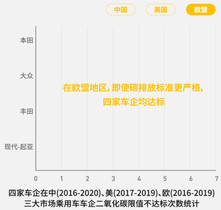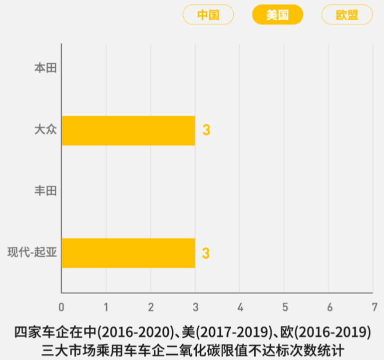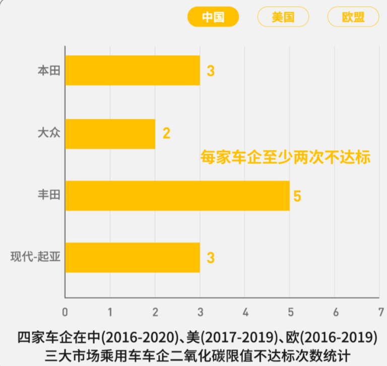 報告數(shù)據(jù)顯示,2016-2020年間,四家車企在中國均至少有兩次不達標,其中豐田五次不達標,本田與現(xiàn)代-起亞三次不達標,大眾則有兩次。