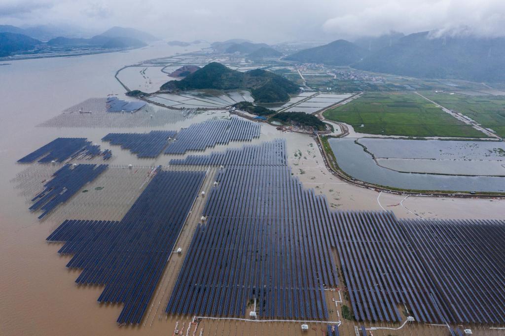 6月29日,國網(wǎng)浙江象山縣供電公司工作人員正在巡檢象山長大涂灘涂光伏設(shè)備。新華社記者 徐昱 攝