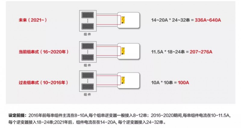 隨著硅片尺寸越來越大以及電池效率越來越高,組件電流不斷提高成為必然趨勢(shì)。我們看到,組件電流越來越大,逆變器功率或匯流箱對(duì)應(yīng)的組串?dāng)?shù)量也不斷增加。
