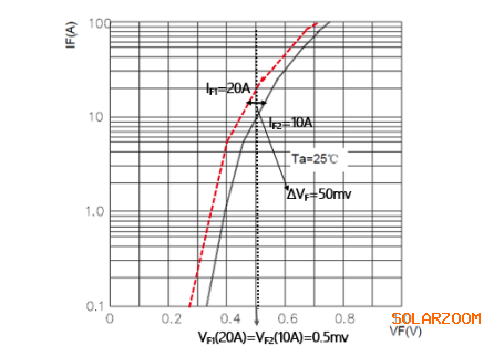 《無法忽視的真相》一文中,作者以二極管正向耐壓曲線來杜撰所謂的并聯(lián)二極管分流特性圖,文中錯誤地標(biāo)識圖表,有意夸大事實、混淆視聽。比如,該圖中列出VF1(20A)= VF2(10A)=0.5mV,而實際上曲線中的數(shù)據(jù)點指向了0.5V,兩者相差1000倍,這種數(shù)據(jù)如何讓人信服?而在幾天之后的另外一篇文章《一圖看懂超大組件接線盒的安全風(fēng)險》中,該文作者又悄然將這部分的內(nèi)容刪除,這是典型的信心缺失。