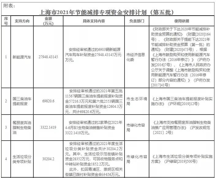 1、按照《財(cái)政部關(guān)于下達(dá)2020年節(jié)能減排補(bǔ)助資金預(yù)算的通知》(財(cái)建[2020]164號(hào))、《財(cái)政部關(guān)于提前下達(dá)2021年節(jié)能減排補(bǔ)助資金預(yù)算(第一批)的通知》(財(cái)建[2020]473號(hào)),根據(jù)《上海市鼓勵(lì)購(gòu)買和使用新能源汽車暫行辦法(2016年修訂)》(滬府辦發(fā)[2016]7號(hào))、《上海市人民政府辦公廳關(guān)于調(diào)整〈上海市鼓勵(lì)購(gòu)買和使用新能源汽車暫行辦法(2016年修訂)部分內(nèi)容的通知〉》(滬府辦發(fā)[2017]41號(hào))等規(guī)定,安排經(jīng)審核通過的6903輛新能源汽車購(gòu)車補(bǔ)貼資金27948.43145萬(wàn)元。