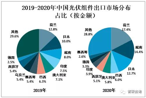2020年中國光伏組件出口金額為169.9億美元,從2020年中國光伏組件出口市場分布占比來看,多數(shù)傳統(tǒng)市場依然保持活力不減,印度、墨西哥等部分市場受疫情影響有所下降,其中荷蘭占比17.4%,越南占比14.4%,日本占比12.7%。
